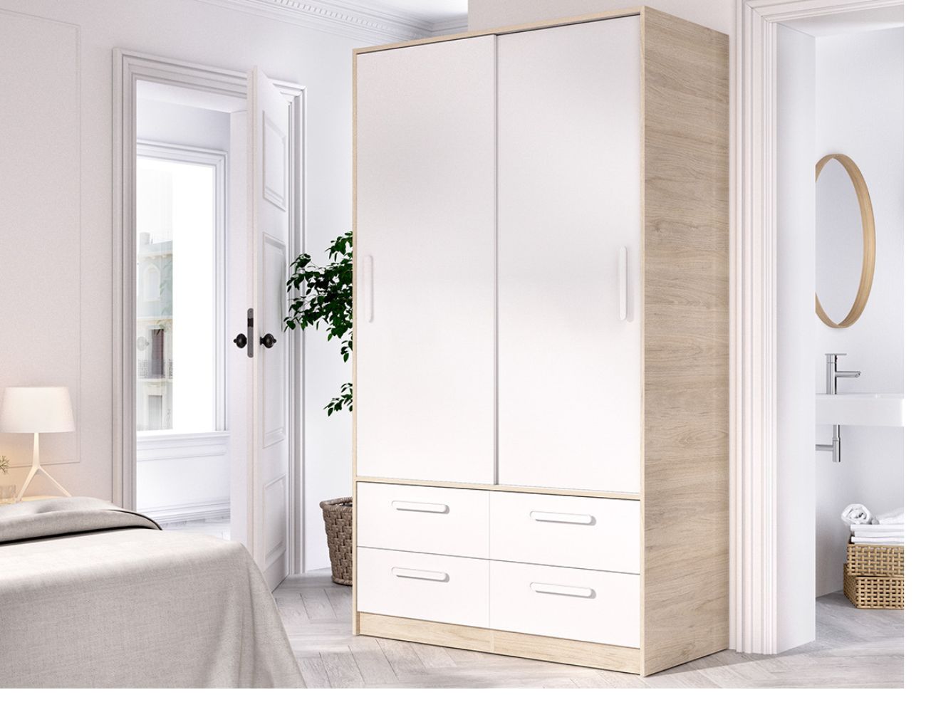 PVPR: 604,21 € 362,52 €Armario de dos puertas correderas con una barra y tres estantes en el interior y cuatro cajones.
